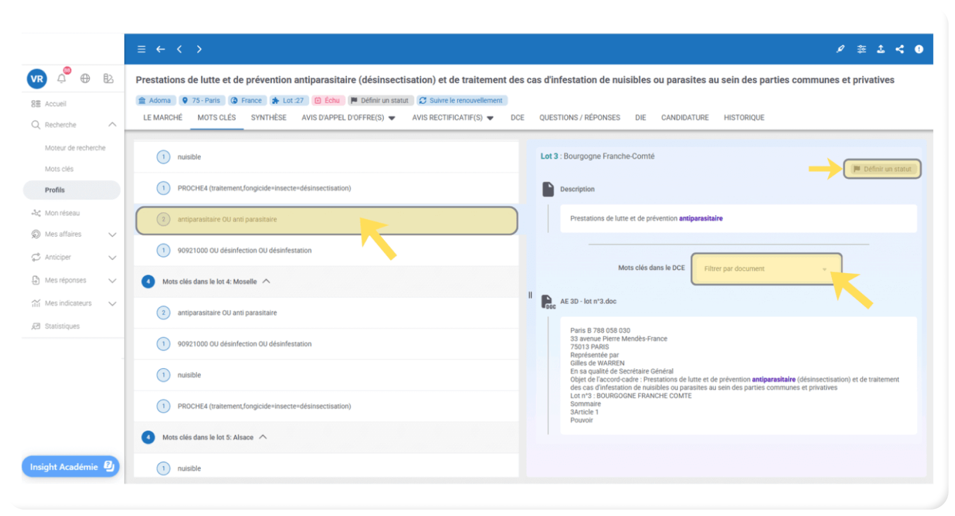 Dans le panneau de gauche, les lots remontés par votre profil apparaîtront immédiatement.
