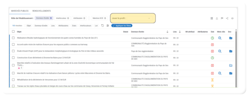 Lorsque vous ouvrez la fiche d’un établissement (Exemple : donneur d’ordre ), vous accédez à la liste de l’ensemble des relations et de l’ensemble des marchés de ce donneur d’ordre. Vous pouvez maintenant affiner ces relations et la liste de marchés, en sélectionnant l’un de vos profils :